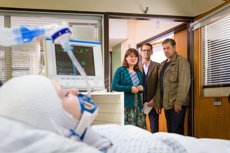 Die 18-jährige Geigerin Paula wird an einem Bahnhof brutal überfallen und auf die Gleise gestoßen. Schwerverletzt liegt sie im Krankenhaus. v.li.: Paula Blanck (Caroline Hartig), Paulas Mutter (Julia Schmidt), Lars Englen (Ingo Naujoks), Finn Kiesewetter (Sven Martinek).