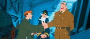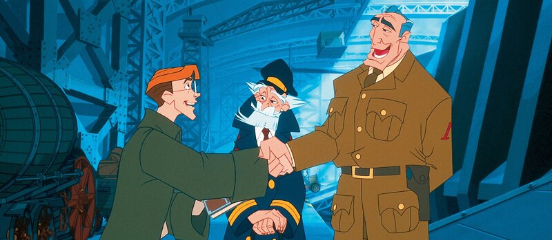 Milo (Mi.) wird von Expeditionsführer Rourke (li.) und seiner Assistentin für die Beschaffung der geheimnisvollen Energiequelle von Atlantis in Beschlag genommen.