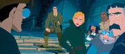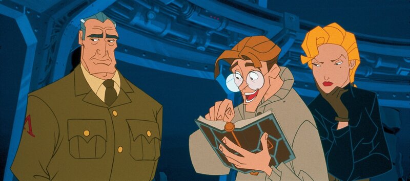 Milo (Mi.) wird von Expeditionsführer Rourke (li.) und seiner Assistentin für die Beschaffung der geheimnisvollen Energiequelle von Atlantis in Beschlag genommen.