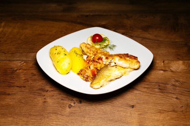 • Die Hauptspeise: Felchenfilet "Rorschacher Art" mit Kartoffeln und Apfelmandelstücken (Apfelmandel ist quasi Rorschacher Art).