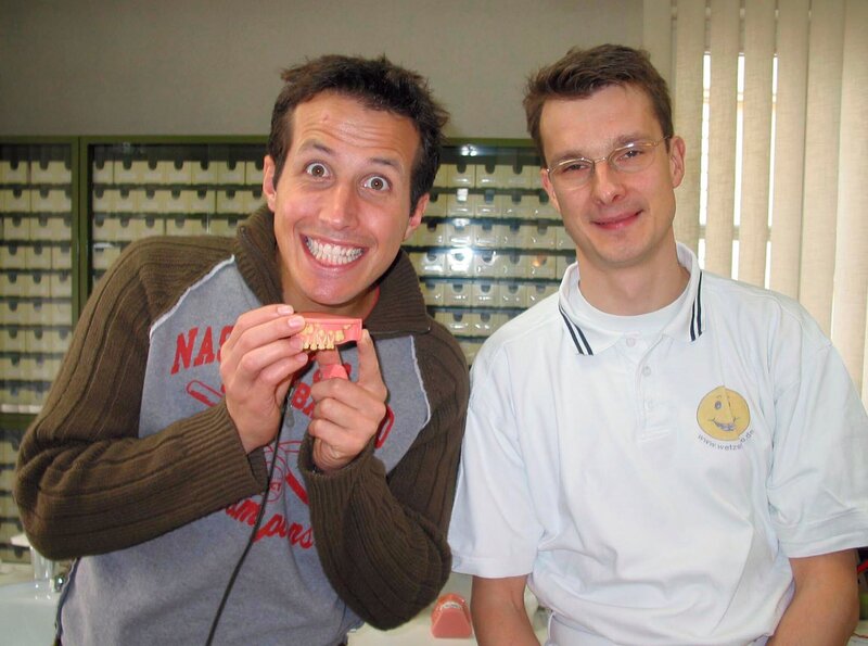 • Der Moderator Willi Weitzel, re. und Herr Wenzel in der Zahnarztpraxis.