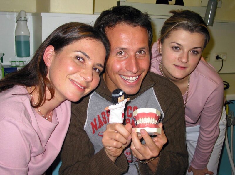Willi mit der Zahnärztin Ana und der Helferin Moni. Ehe er sich versieht, sitzt er selber auf dem Behandlungsstuhl.