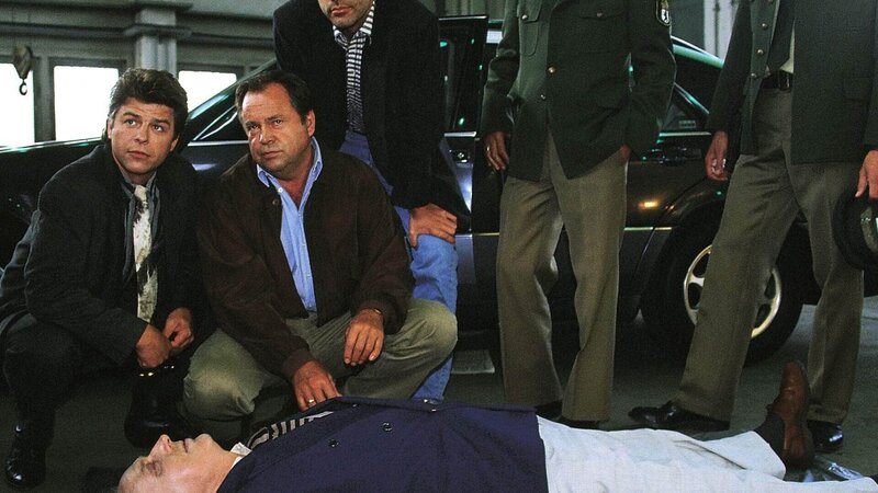 Kriminalkommissar Peter Wolniak (Uwe Fellensiek, l.) und Kriminalhauptkommissar Stefan Kehler (Wolfgang Bathke, 2.v.l.) untersuchen die Leiche des Gemüsehändlers Kuchel. (restliche Personen Komparsen)