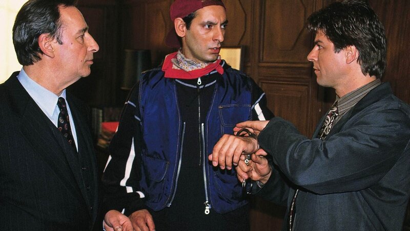 Kallmann (Udo Jolly) wird von Obertaatsanwalt Lotze (Henry van Lyck, li.) und Kommissar Wolniak (Uwe Fellensiek) als Hauptverdächtiger festgenommen.