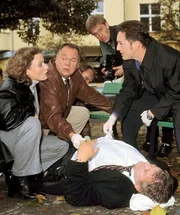 Der Unternehmensberater Erwin Steinhäuser (Komparse, lieg.) wird tot aufgefunden. Staatsanwältin Clausen (Brigitte Beyeler), Kehler (Wolfgang Bathke, 2.v.l.) und Bongartz (Max Gertsch) ermitteln (hi. Komparse).