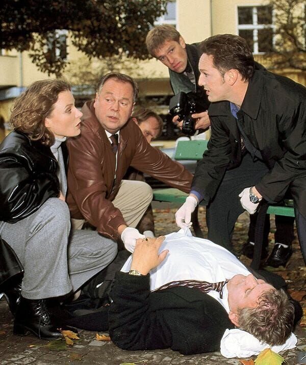 Der Unternehmensberater Erwin Steinhäuser (Komparse, lieg.) wird tot aufgefunden. Staatsanwältin Clausen (Brigitte Beyeler), Kehler (Wolfgang Bathke, 2.v.li.) und Bongartz (Max Gertsch) ermitteln (hi. Komparse).