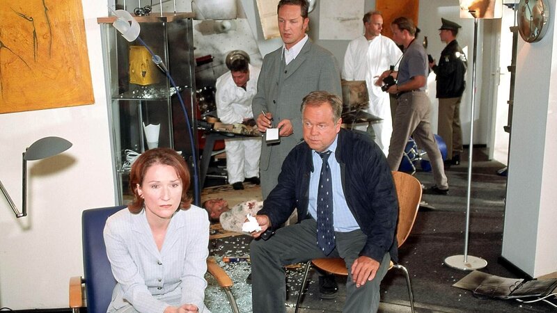 • Birgit Müller (Silvia Rachor, l.) ist völlig ahnungslos weshalb ihr Geschäft von einer Bombe zerstört wurde, bei der ihre Angestellte (hinten) ums Leben kam. Kehler (Wofgang Bathke, r.) und Bongartz (Max Gertsch) ermitteln bereits.