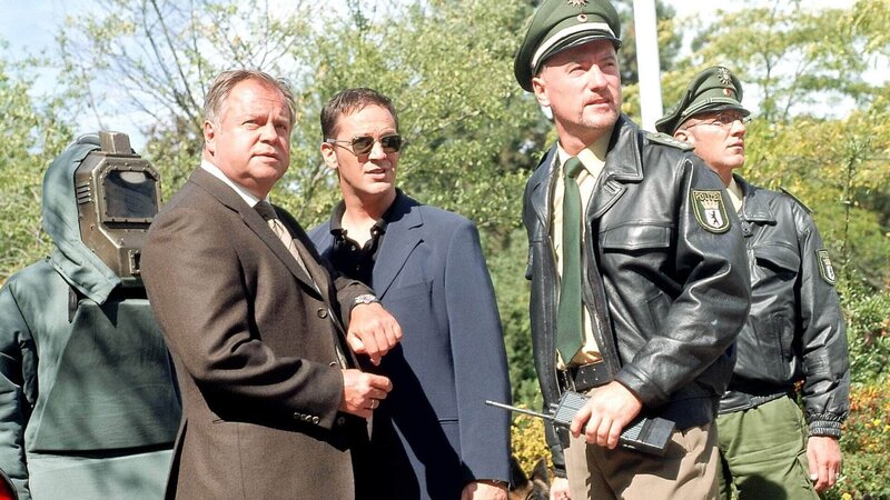 • Den Sprengstoffexperten ist es nicht gelungen, die Bombe zu finden. Bongartz (Max Gertsch, 2.v.l.) und Kehler (Wolfgang Bathke, 3.v.l.) lassen den Sprengstoffeinsatzleiter (Steven Seitz, 4.v.l.) den Einsatz abbrechen.