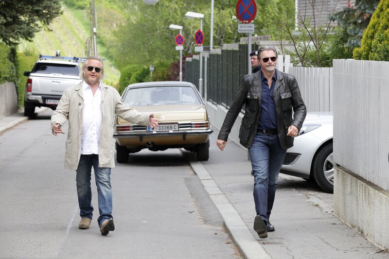 Nowak und Ribarski eilen in den Garten von Richter Schiller, der tot aufgefunden wurde. (v.l.n.r. Oberstleutnant Helmuth Nowak (Gregor Seberg), Major Carl Ribarski (Stefan Jürgens)). "SOKO Wien - Tigran der Unsichtbare": Nowak und Ribarski auf dem Weg zur Villa von Richter Schiller. Fotograf: Stefan Haring