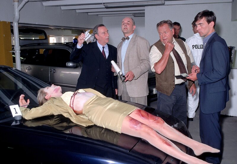 Die Kommissare Bonhoff (Wolfgang Krewe, re.) und Bathke (Wolfgang Bathke, 2.v.re.), der Gerichtsmediziner Duhler (Klaus Schindler, 2.v.li.) und Staatsanwalt Lotze (Henry van Lyck) untersuchen den Mord an einer jungen Frau (Komparsin).