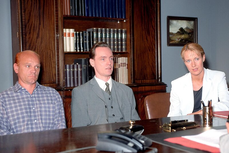 Rechtsanwalt Schubert (Karl-Heinz von Liebezeit, Mi.) versucht seinen Mandanten Wieland (Ulrich Gebauer, li.) aus der Untersuchungshaft freizubekommen (re. Britta Schmeling).