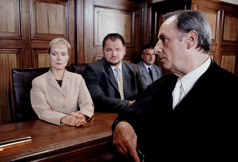 Dagmar (Marina Krogull) und Walter (Michael Trischan) Schenk stehen im Verdacht, die leibliche Mutter ihrer Adoptivtochter umgebracht zu haben. Staatsanwalt Lotze (Henry van Lyck, r.) nimmt sie ins Verhör.