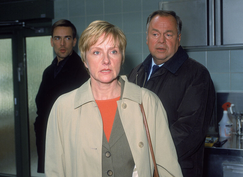 • Die Großmutter des ermordeten Mädchens, Anna Kurz (Ruth Reinicke), versucht bei den Kommissaren Bonhoff (Wolfgang Krewe, hi.li.) und Kehler (Wolfgang Bathke) den Verdacht auf den gewalttätigen Vater des Kindes zu lenken.