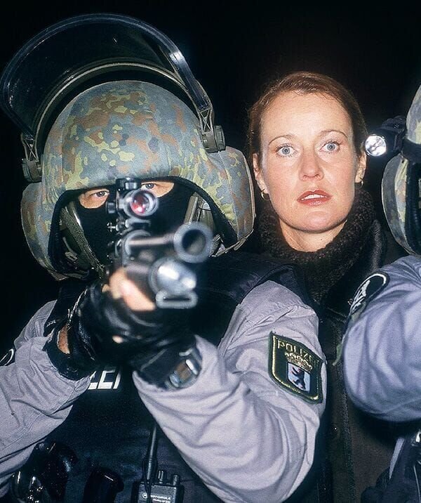 Feldmann (Oliver Reinhard, re.), der Ehemann der Entführten, versucht die Absperrung der Polizei zu durchbrechen, um zu seiner Frau zu kommen. Kommissar Kehler (Wolfgang Bathke) gelingt es nicht, ihn aufzuhalten.