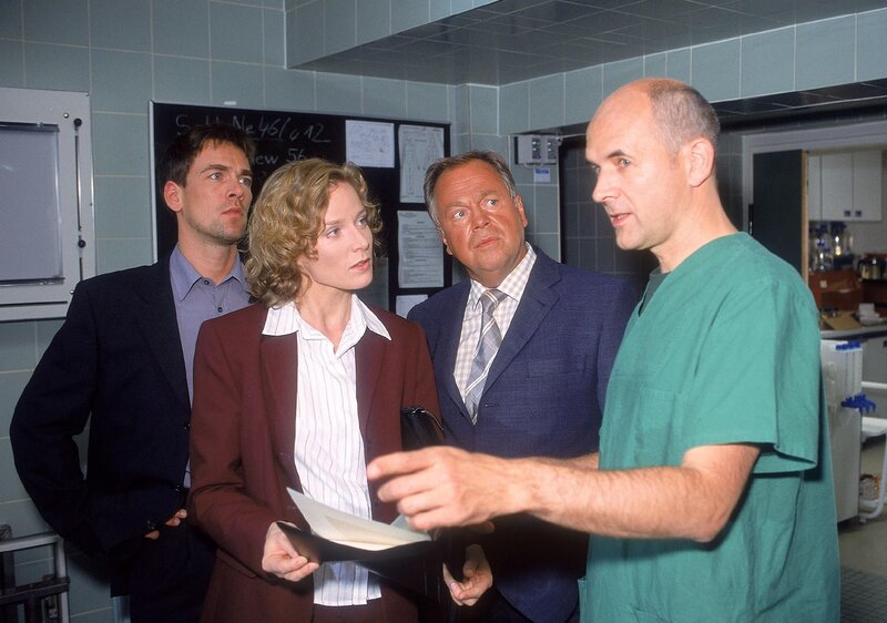 Dr. Duhler (Klaus Schindler, re.) erläutert den Kommissaren Bonhoff (Wolfgang Krewe, li.) und Kehler (Wolfgang Bathke, 2.v.re.) und Staatsanwältin Clausen (Brigitte Beyerle) die Ergebnisse der Obduktion.