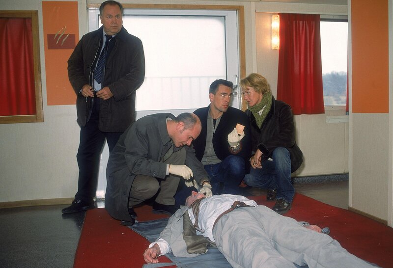 Firmenchef Bahlow (Arnold Dammann, lieg.) wurde ermordet. Gerichtsmediziner Dr. Duhler (Klaus Schindler, 2.v.li.) gibt den Kommissaren (li. Wolfgang Bathke, 2.v.re Wolfgang Krewe) und der Staatsanwältin (Britta Schmeling) erste Hinweise auf die Todesursache.