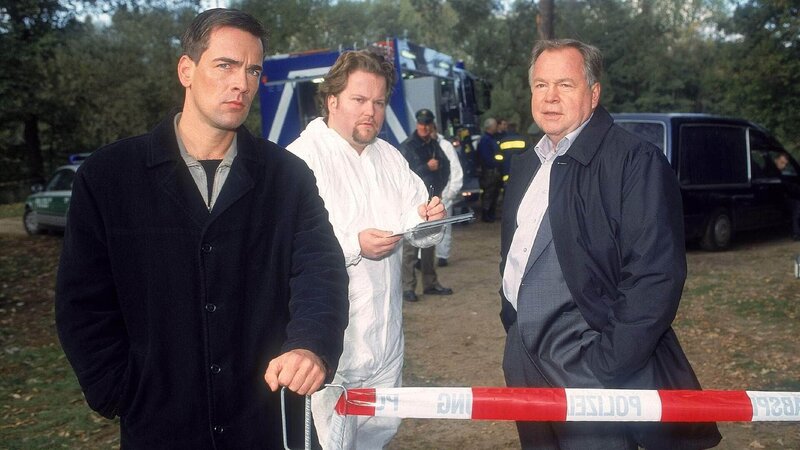 Die Beamten untersuchen den Tatort. PTU Weis (Georg Prokop, Mi.) informiert Kommissar Bonhoff (Wolfgang Krewe, li.) und Kommissar Kehler (Wolfgang Bathke) über seine ersten Erkenntnisse.