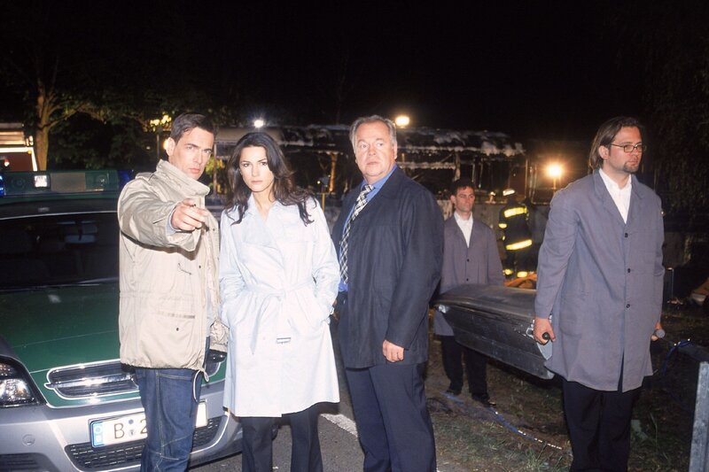 Ein Bus mit Kindern einer Basketballmannschaft ist verunglückt. Die Kriminalkommissare Bonhoff (Wolfgang Krewe, li.) und Kehler (Wolfgang Bathke, Mi.) sowie Staatsanwältin Lisa Sturm (Mariella Ahrens) treffen am Unglücksort ein. (re. Komparsen)