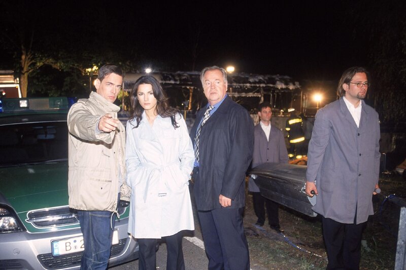 • Ein Bus mit Kindern einer Basketballmannschaft ist verunglückt. Die Kriminalkommissare Bonhoff (Wolfgang Krewe, li.) und Kehler (Wolfgang Bathke, Mi.) sowie Staatsanwältin Lisa Sturm (Mariella Ahrens) treffen am Unglücksort ein. (re. Komparsen)