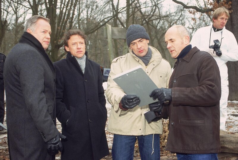 • Eine Kinderleiche wurde gefunden; Kommissar Kehler, Oberstaatsanwalt Kampen und Kommissar Bonhoff lassen sich die Ergebnisse des Gerichtsmediziners zeigen.