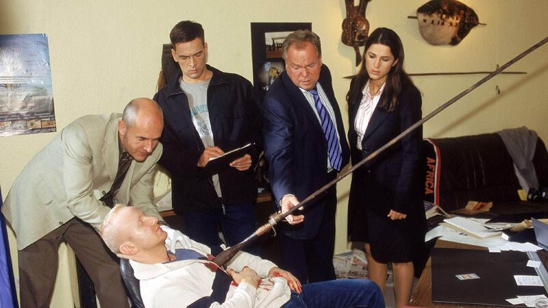 In einem Jugendheim wurde ein Sozialarbeiter ermordet. Dr. Duhler (Klaus Schindler, li.), Kommissar Bonhoff (Wolfgang Krewe, 2.v.li.), Kommissar Kehler (Wolfgang Bathke) und Staatsanwältin Sturm (Mariella Ahrens) untersuchen den Tatort.