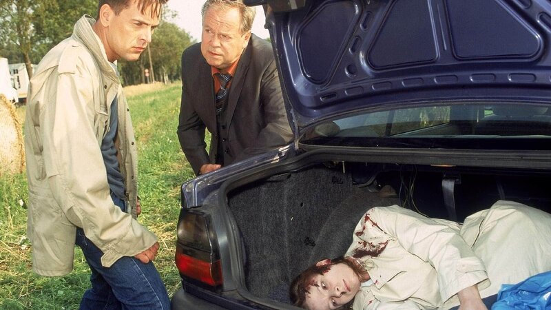 Die Beamten Bonhoff (Wolfgang Krewe, li.) und Kehler (Wolfgang Bathke) entdecken im Kofferraum des Fluchtautos eine Frauenleiche. Sind die beiden Jugendlichen die Täter? Oder hat jemand anderes die Frau auf dem Gewissen?