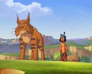 Kleiner Dachs und Yakari geben an und plustern sich vor ihrer Freundin Regenbogen auf. Kühner Rabe würde ganz dringend ihre Hilfe bei der Mustangjagd brauchen und natürlich könne eine Squaw nicht mitkommen. Im Wald sei es viel zu gefährlich für ein kleines Mädchen. Auch wenn Regenbogen sauer ist, die Jungen gehen alleine los. Bald schon erweisen sie sich aber als zu unerfahren. Sie sind viel zu laut, der Mustang ist gewarnt und entkommt ihnen. Kühner Rabe lehrt die beiden, in Ruhe Spuren zu lesen, doch schnell geraten Kleiner Dachs und Yakari in einen Wettstreit, wer besser Spuren lesen kann. Kühner Rabe rät ihnen, sich zusammen zu tun, dann könnten es beide gut lernen. Aber da geraten die beiden Freunde an seltsam große Bisonspuren, die sie sich nicht erklären können. Nach ihrer Vorstellung müsste der Bison groß wie ein Berg sein, fliegen und auf Bäume klettern können. Seltsamerweise führen die Spuren zurück ins Lager der Sioux, wo sie einen solchen Bison natürlich nicht finden. Aber warum lacht Regenbogen so?