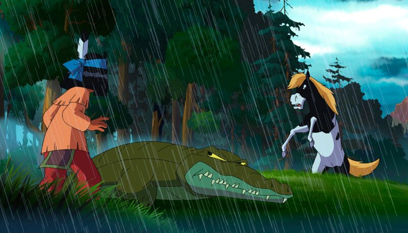 Lange Schwarze Nacht, ein dunkler Hengst und der Anführer einer Herde Wildpferde, schimpft mit Morgenröte, dem jungen Fohlen. Durch ihr dauerndes verschrecktes Wiehern, hat sie bestimmt schon den Puma auf die Herde aufmerksam gemacht, in dessen Revier die Pferde versehentlich gelandet sind. Aus Angst vor Lange Schwarze Nacht nimmt Morgenröte Reißaus und galoppiert davon. Besorgt macht sich ihre Mutter sofort auf den Weg, das kleine Fohlen zu suchen und zur Herde zurück zu bringen, wo es in Sicherheit ist. Yakari und Kleiner Donner haben die Szene beobachtet und machen sich ebenfalls daran, Morgenröte zu finden. Schließlich finden sie das völlig verängstigte Pferdemädchen bedroht von dem gefährlichen und hungrigen Puma. Durch ihr beherztes Eingreifen können Yakari und Kleiner Donner einen Angriff des Pumas abwehren. Aber nun will Morgenröte nicht zurück zu ihrer Herde, weil sie vor Lange Schwarze Nacht Angst hat.
