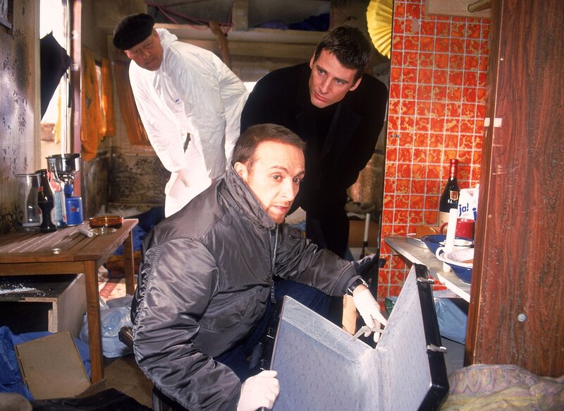 Die Beamten Bonrath (Gottfried Vollmer, li.), Tom (Rene Steinke, Mi.) und Semir (Erdogan Atalay) finden am Unfallort einen Koffer mit Diamanten.
