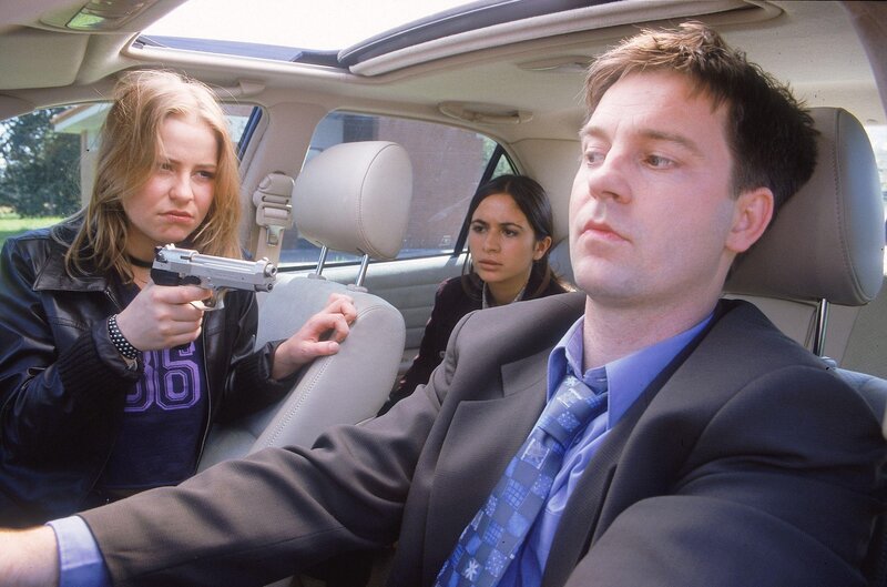 • Tina (Theresa Scholze, li.) bedroht den BMW-Fahrer (Tillmann Schillinger) und will, dass er den Wagen verlässt...(hi. Pinar Erincin als Aysim)