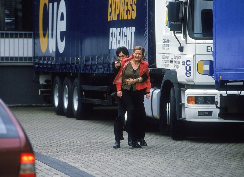 • Lehmann (David Steffen) nimmt Monika (Jennifer Steffens) als Geisel, um sich seinen Fluchtweg zu sichern...