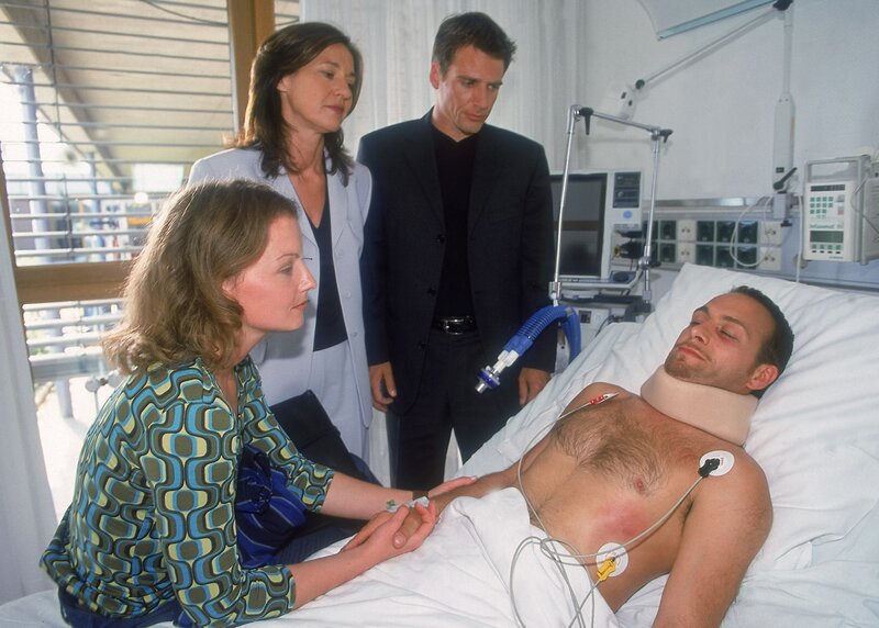 Semir (Erdogan Atalay, re.) erfährt von (v.li.) Andrea (Carina Wiese), seiner Chefin Engelhardt (Charlotte Schwab) und Tom (Rene Steinke), dass er unter Drogeneinfluss gestanden hat und es jemand auf ihn abgesehen hat.