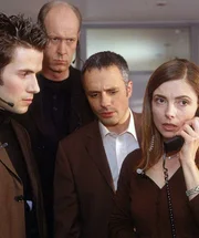 • Jan (Christian Oliver, 2.v.li.) und Bonrath (Gottfried Vollmer, li.) präparieren den Geldkoffer bei den Beatrice (Nana Krüger) und Niklas Gerlach (Rene Hofschneider).