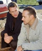Tom (Rene Steinke, li.) und Semir (Erdogan Atalay) entdecken in Stallers Wagen ein frisches Einschussloch und ein One-Way-Ticket nach Chile. Er scheint auf der Flucht gewesen zu sein. Aber vor wem?