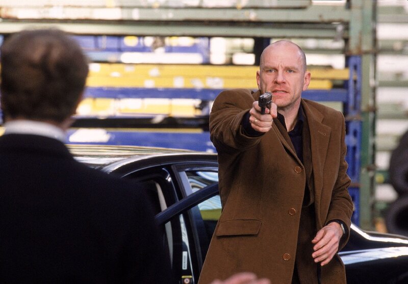 König (Matthias Komm, li.) hat Carstens Bruder Robert als Geisel genommen, er will von Carsten (Götz Schubert) die brisanten Unterlagen. Doch der hat sich eine Waffe besorgt und zielt auf König...