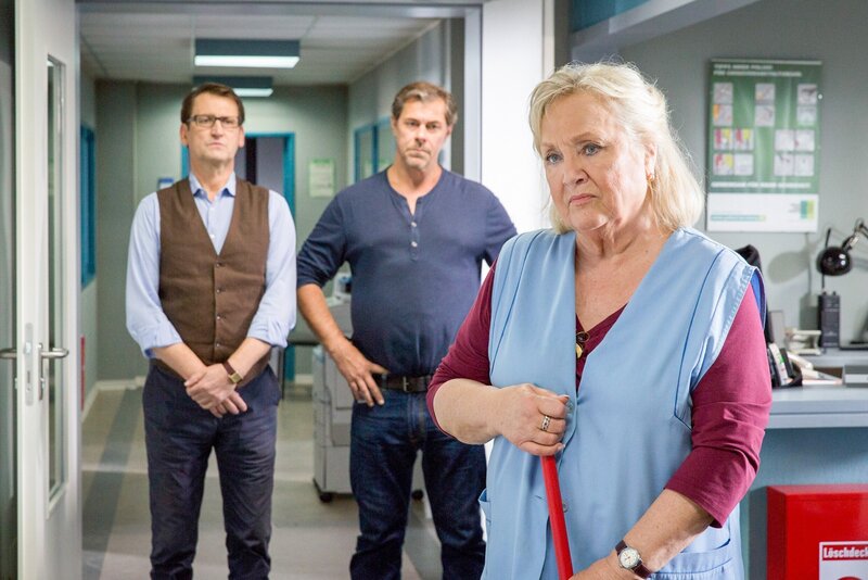 Ein Geldtransporter wurde brutal überfallen. Finn Kiesewetter (Sven Martinek, M.), Lars Englen (Ingo Naujoks, l.) befragen Maria Benneke (Doris Kunstmann, r.), die Mutter von einem der Fahrer.