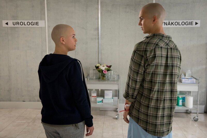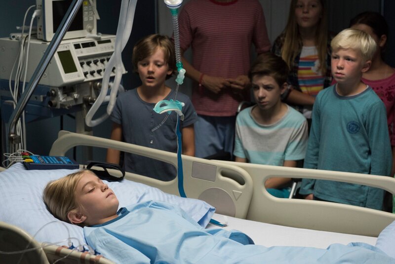 Sara (Luna Maxeiner) liegt im Koma. Hugo (Nick Julius Schuck, 2.v.l.) und die anderen Kinder der Kinderstation möchten, dass sie wieder aus dem Koma erwacht.