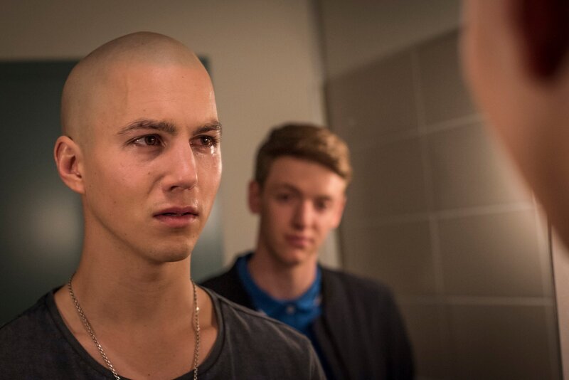 V.l.: Die Clubmitglieder Jonas (Damian Hardung, Toni (Ivo Kortlang), Leo (Tim Oliver Schultz), Emma (Luise Befort) und Hugo (Nick Julius Schuck) nehmen Abschied von einem guten Freund.