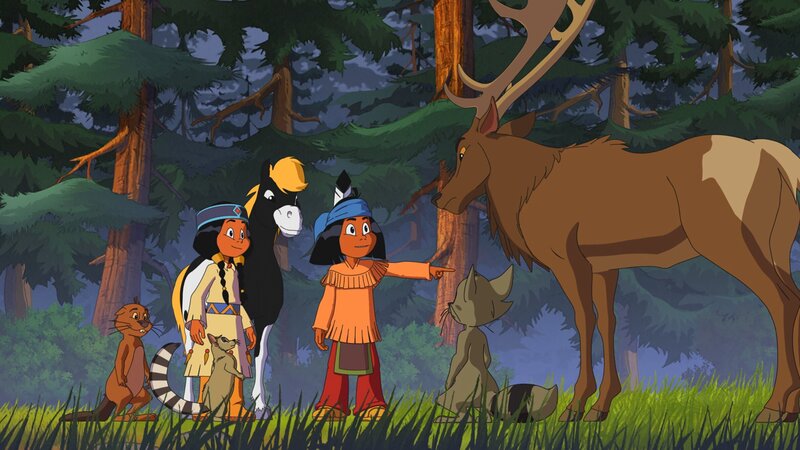 (v.l.) Lindenbaum, Regenbogen, Kleiner Donner, Yakari, Schwarze Maske und ein Wapiti