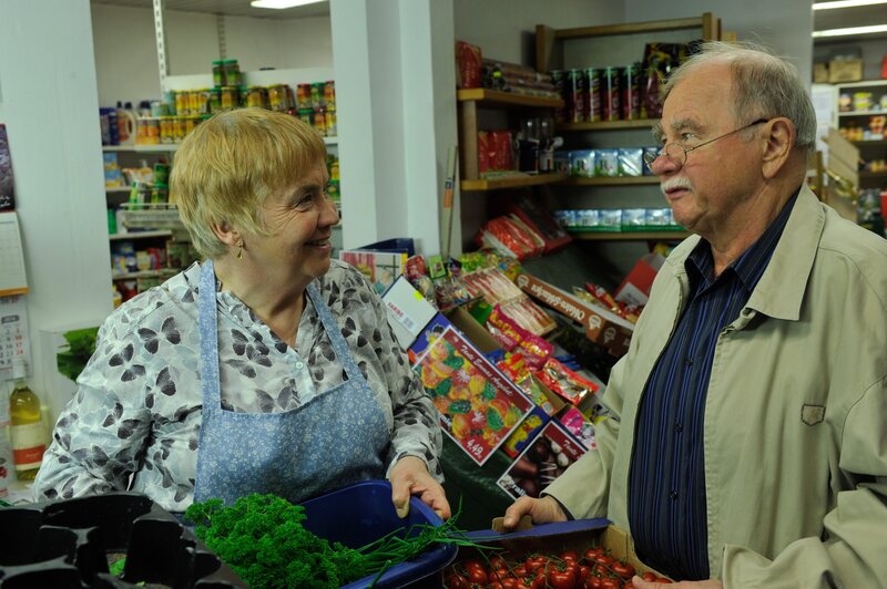 Nach dem Tod von Emma Bukowskis Schwester (Sabine Wackernagel) geht der Renter Harry Klein (Ernst Konarek) ihr tatkräftig zur Hand, damit der Laden wieder eröffnen kann.