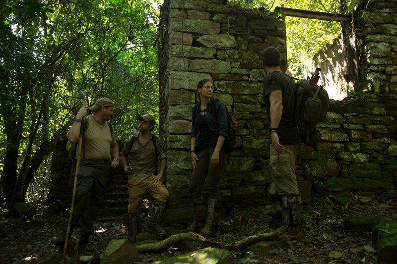The team (Cork Graham, Emilio White, Mehgan Heaney-Grier, Brett Tutor) examine possible Nazi house ruins.