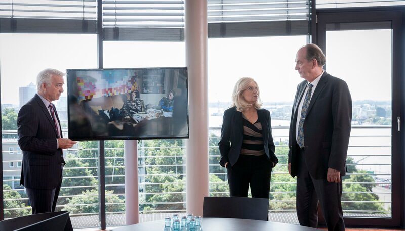 • Anwalt Wieland Krohn (Christoph M. Ohrt, l.) präsentiert Markus Gellert (Herbert Knaup, r.) und Isa von Brede (Sabine Postel, 2.v.r.) ein Video, dass eindeutig belegt, dass ihr Mandant Daniel Bienert die App nicht entwickelt hat.