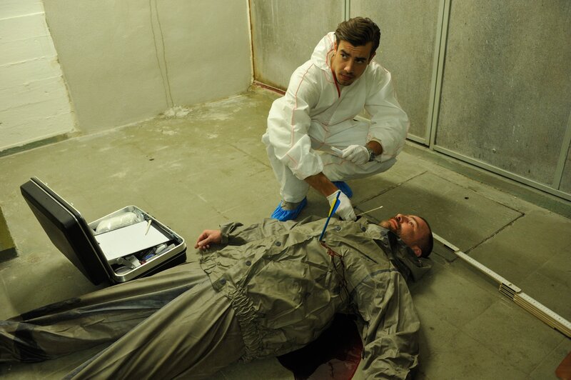 Benedikt Förster (Florian Wünsche, kniend) führt am Opfer Erik Pabst (Robert Arnold, liegend) die erste Leichenschau durch. Das Opfer wurde durch einen Armbrustpfeil getötet.