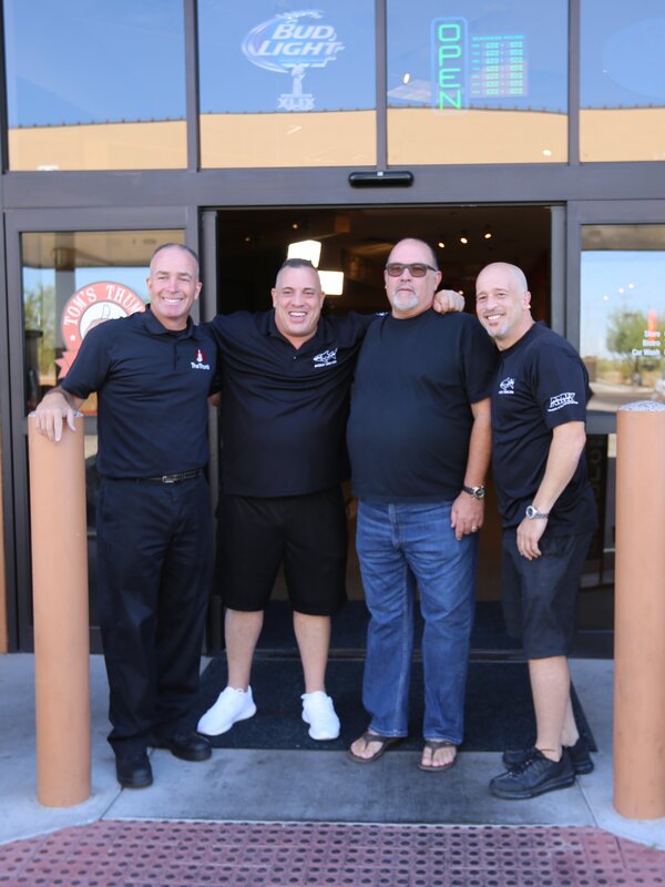 Wayde und Brett posieren draußen am Thumb mit Besitzer Kip Lassetter und General Manager Mike Lawson.