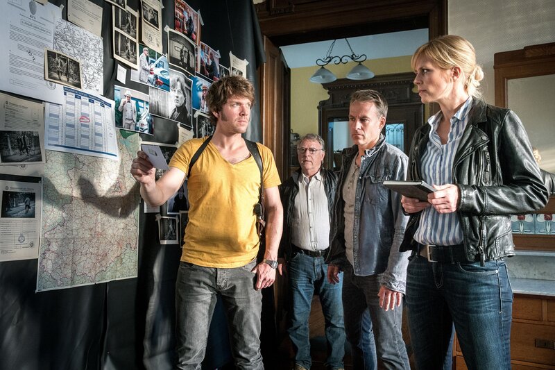 Tom Kowalski (Steffen Schroeder, l.), Hajo Trautzschke (Andreas Schmidt-Schaller, 2.v.l.), Jan Maybach (Marco Girnth, 2.v.r.) und Ina Zimmermann (Melanie Marschke, r.).