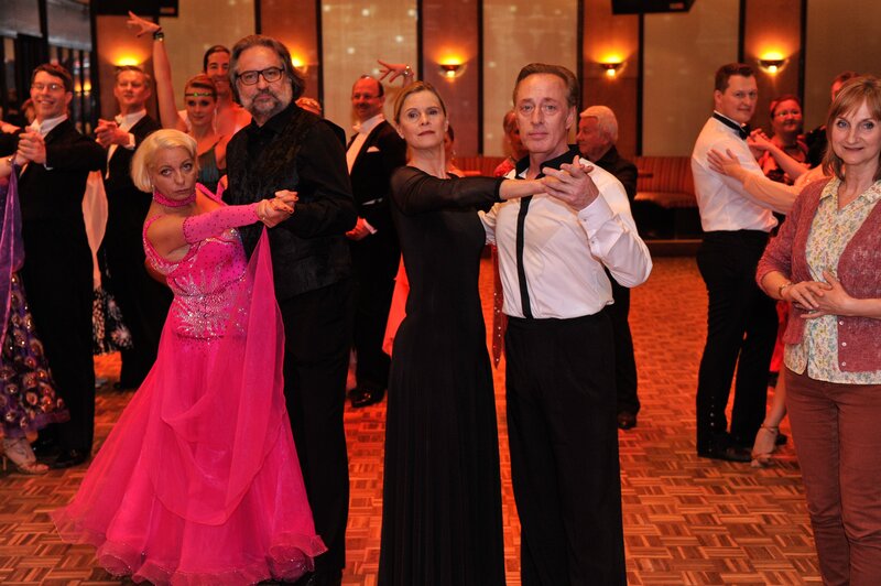 • Die Kleidung passt, die Frisur sitzt und die Paare strahlen: Auf dem Parkett der Tanzschule schwingen Sarah Kortner (Manon Straché, l.), ihr Mann Klaus (Andreas Windhuis, 2.v.l.), Vera (Leslie Malton, M.) und Dietmar Wörbel (Wilfried Hochholdinger, 2.v.r.) gemeinsam mit anderen Tanzpaaren das Tanzbein. Melanie Schultz (Petra Nadolny, r.) steht dabei und würde gerne mitmachen.