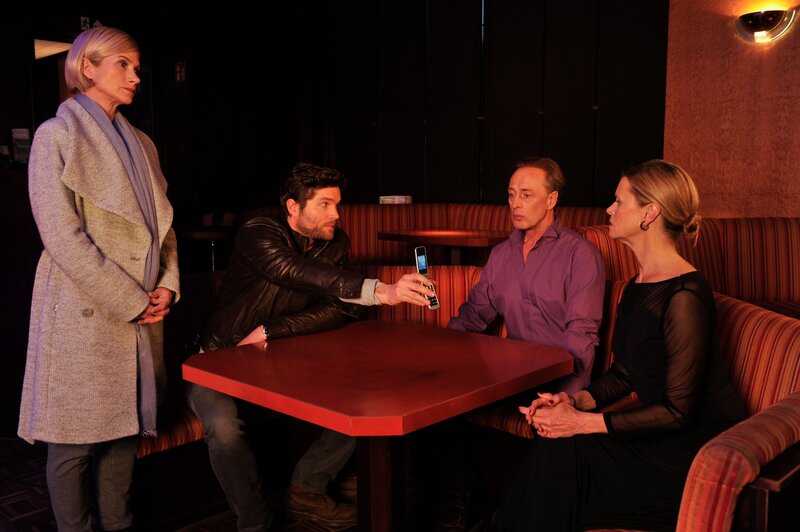 • In der ersten Befragung präsentieren Martina Seiffert (Astrid M. Fünderich, l.) und Jo Stoll (Peter Ketnath, 2.v.l.) Dietmar (Wilfried Hochholdinger, 2.v.r.) und Vera Wörbel (Leslie Malton, r.) ein Bild der Tatwaffe. Die Tanzschulen-Besitzer sind sich nicht sicher, ob die Steckerleiste zu ihrem Bestand gehört.