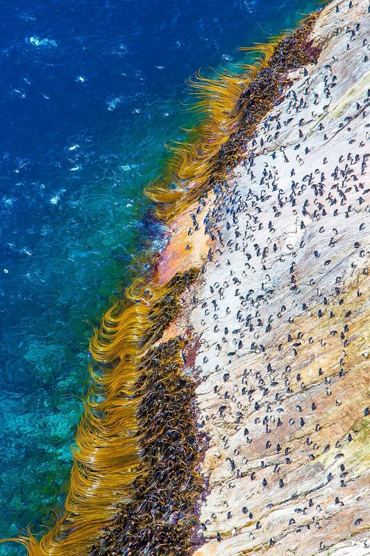 • Die Küste von Snares Island. Um zu ihren Brutkolonien im Wald zu gelangen, müssen Snarespinguine zuerst die bis zu 130 Meter steile Küste der Insel überwinden.