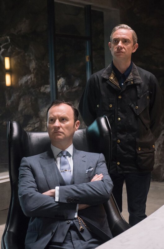 Mycroft (Mark Gatiss, li.) und Watson (Martin Freeman) begleiten Sherlock auf die Gefängnisinsel Sherrinford.