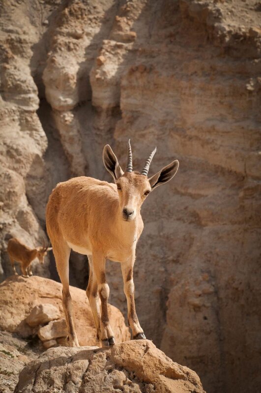 • Die Weibchen des Nubischen Steinbocks gebären ihre Jungen hoch oben auf steilen Felsvorsprüngen, unerreichbar für Raubtiere. Täglich müssen die Mütter die bröckeligen Felswände hinab ins Tal, um zu trinken und zu fressen.